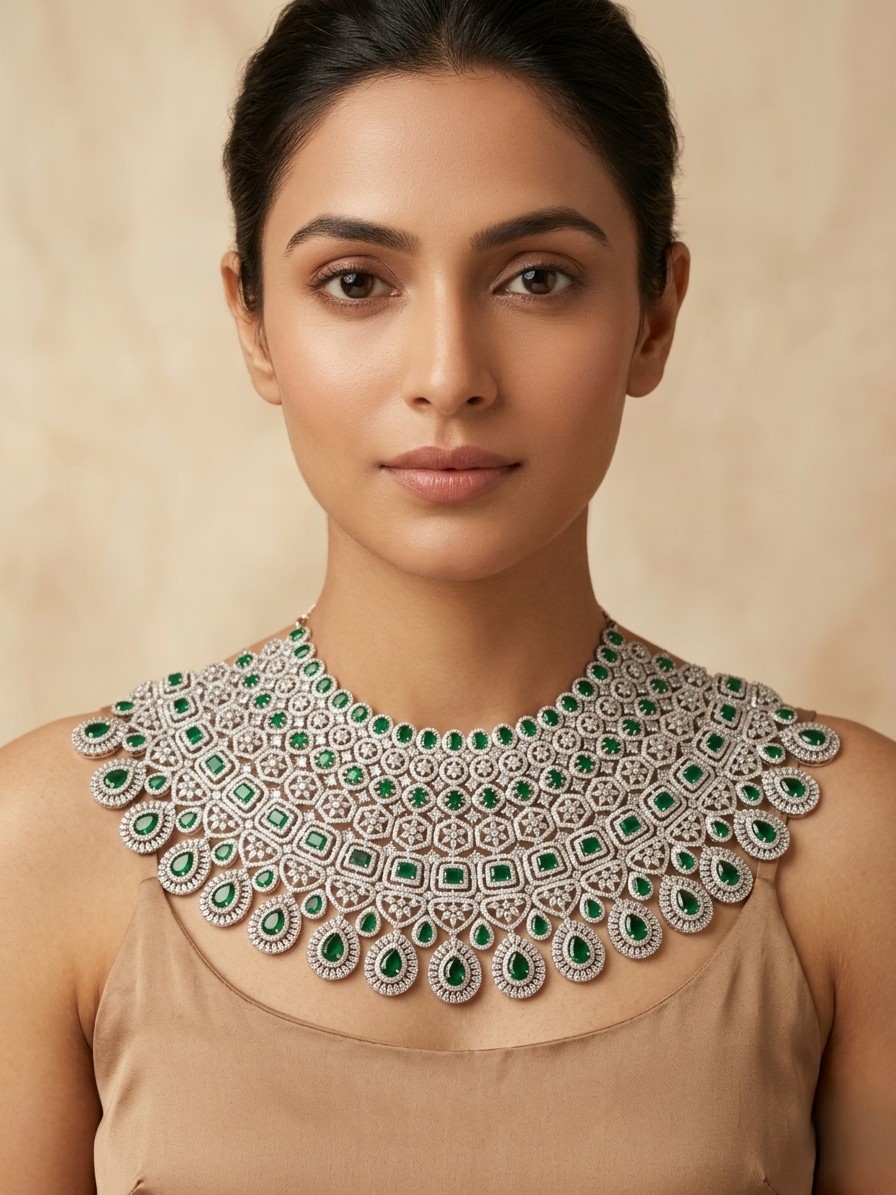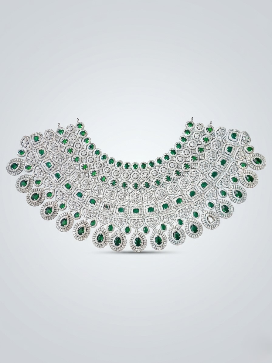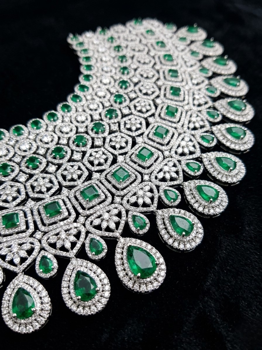This luxurious choker features a wide, intricately crafted structure adorned with shimmering American diamonds in a geometric and floral lattice pattern. Highlighted with vibrant emerald green stones set in symmetrical motifs, the design is finished with elegant teardrop danglings that add movement and brilliance. The dense detailing and layered composition create a majestic and opulent look.
