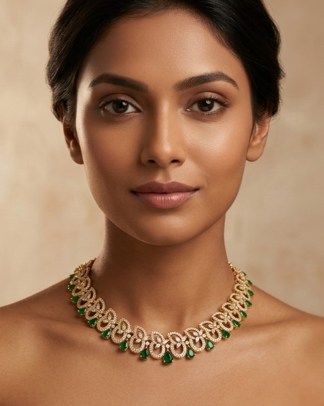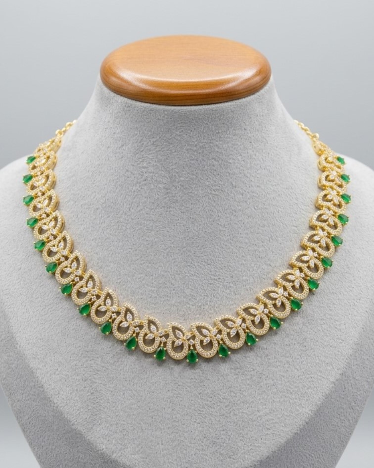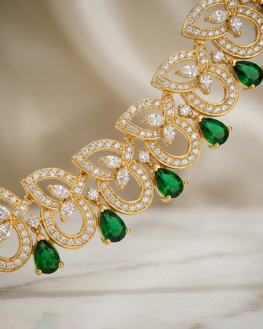 Emerald Green Drop & American Diamond Gold Necklace | Elegant Bridal & Festive Jewelry