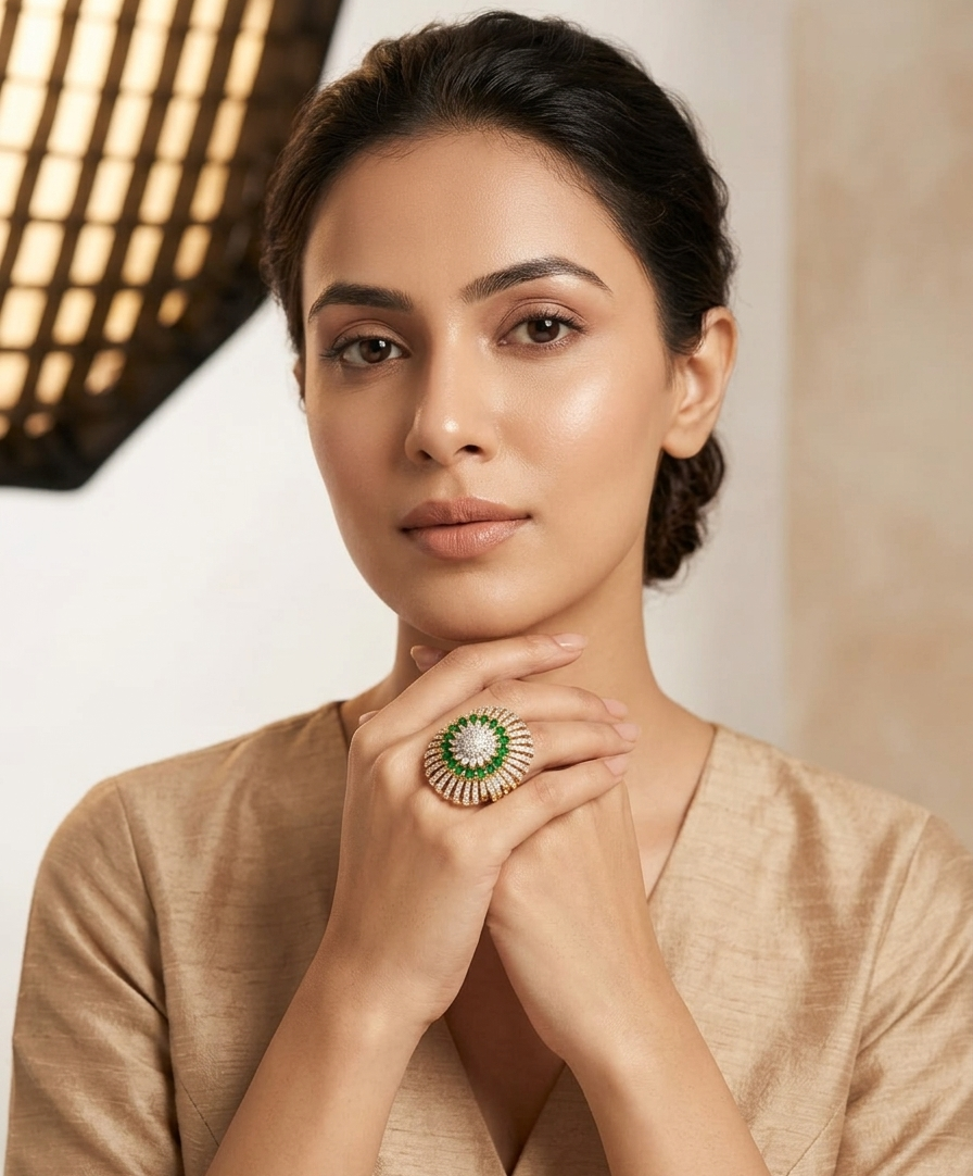 Pair this ring with both traditional and contemporary outfits in shades like ivory, beige, gold, or green for a chic look. Keep other accessories minimal to let this standout piece take all the attention.