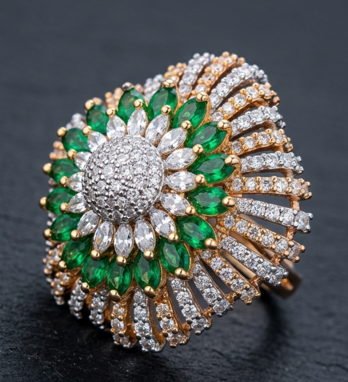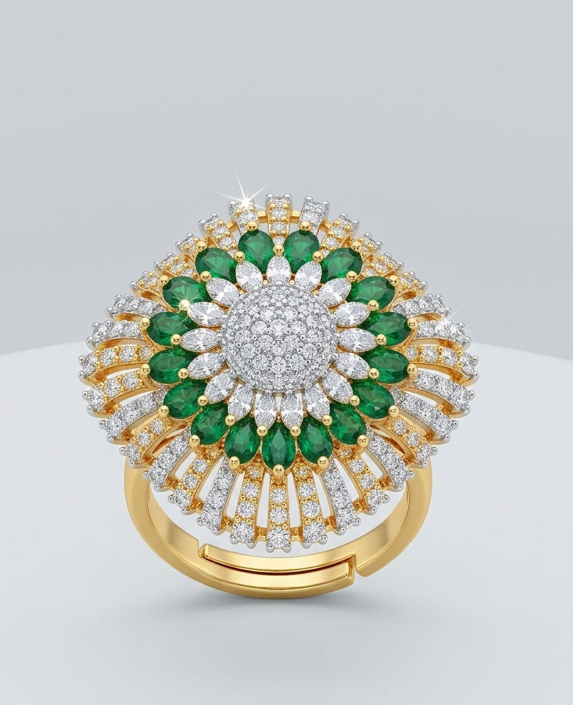Inspired by radiant floral blooms and sunburst patterns, this statement ring captures the essence of elegance and brilliance. The vibrant emerald green accents add a refreshing touch, symbolizing beauty and timeless charm.