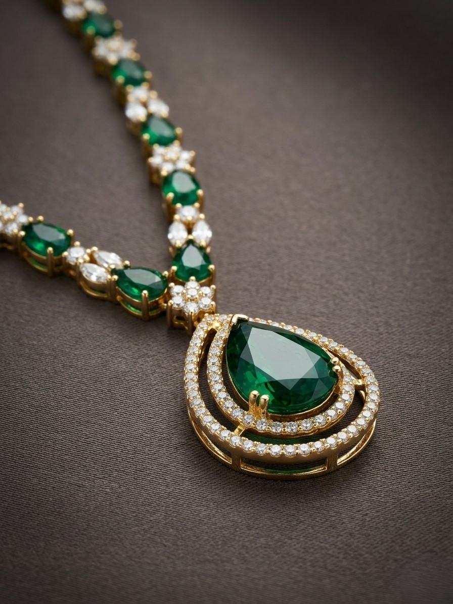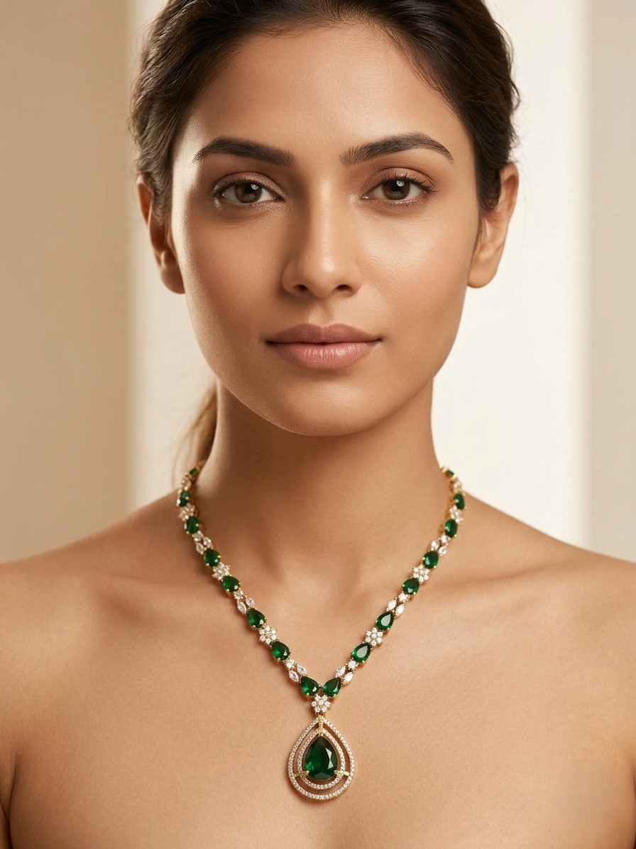 Inspired by timeless elegance and classic gemstone jewellery, this necklace reflects refined beauty with a luxurious touch. The deep emerald green centrepiece evokes sophistication, making it perfect for both modern and traditional styling.