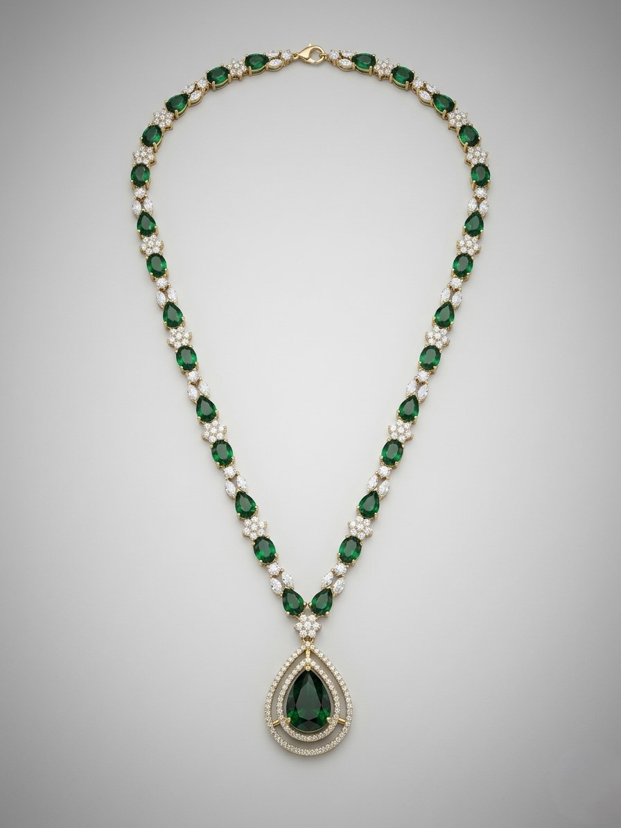 This necklace features a gold-tone finish with a delicate chain adorned with alternating emerald green stones and sparkling American diamonds. The highlight is a stunning teardrop-shaped pendant, framed with shimmering stones and cantered with a rich green gemstone that creates a bold yet graceful focal point. The balanced design offers a seamless blend of simplicity and luxury.