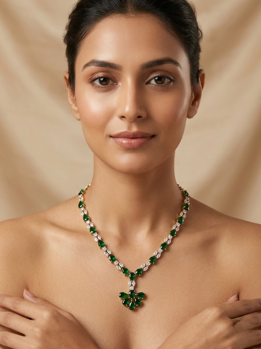 Inspired by delicate floral patterns and graceful symmetry, this necklace reflects understated elegance with a refined modern touch. The rich emerald green tones bring a sense of freshness and timeless charm, perfect for both festive and formal occasions.