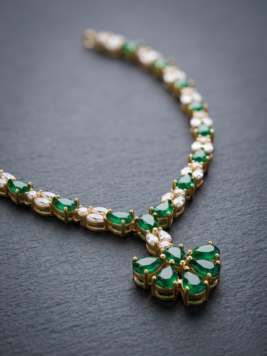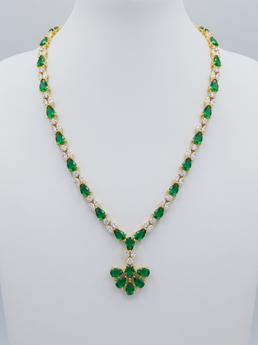 This necklace features a gold-tone finish with a sleek and minimal chain adorned with alternating emerald green teardrop stones and shimmering American diamonds. The highlight is a floral-inspired pendant crafted with clustered green stones, creating a soft and elegant focal point. The balanced design offers just the right amount of sparkle and color, making it versatile and sophisticated.
