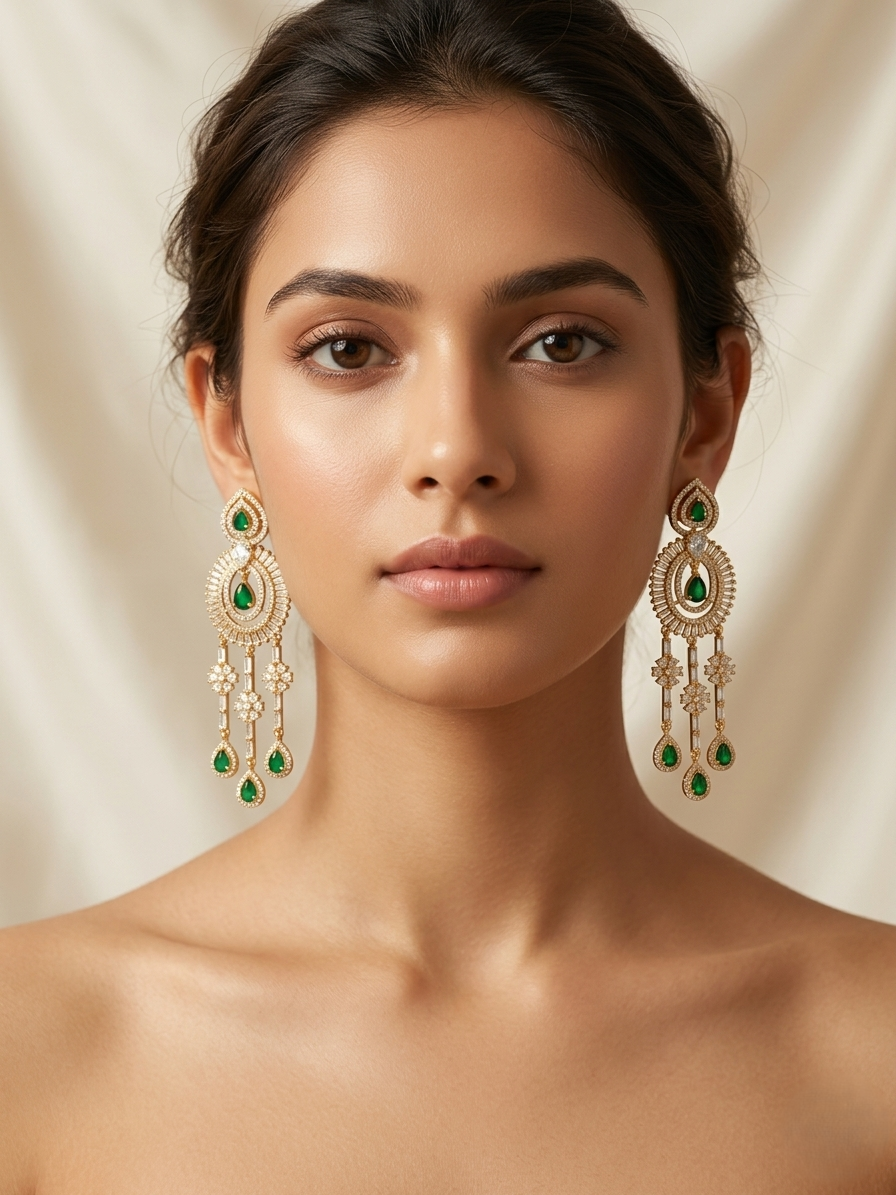 Style these earrings with traditional outfits like sarees, lehengas, or anarkalis in shades of green, gold, ivory, or deep jewel tones. For a modern twist, pair them with minimalist gowns or fusion wear. Opt for a sleek bun or side-parted hairstyle to highlight the elongated design and allow the earrings to stand out beautifully.