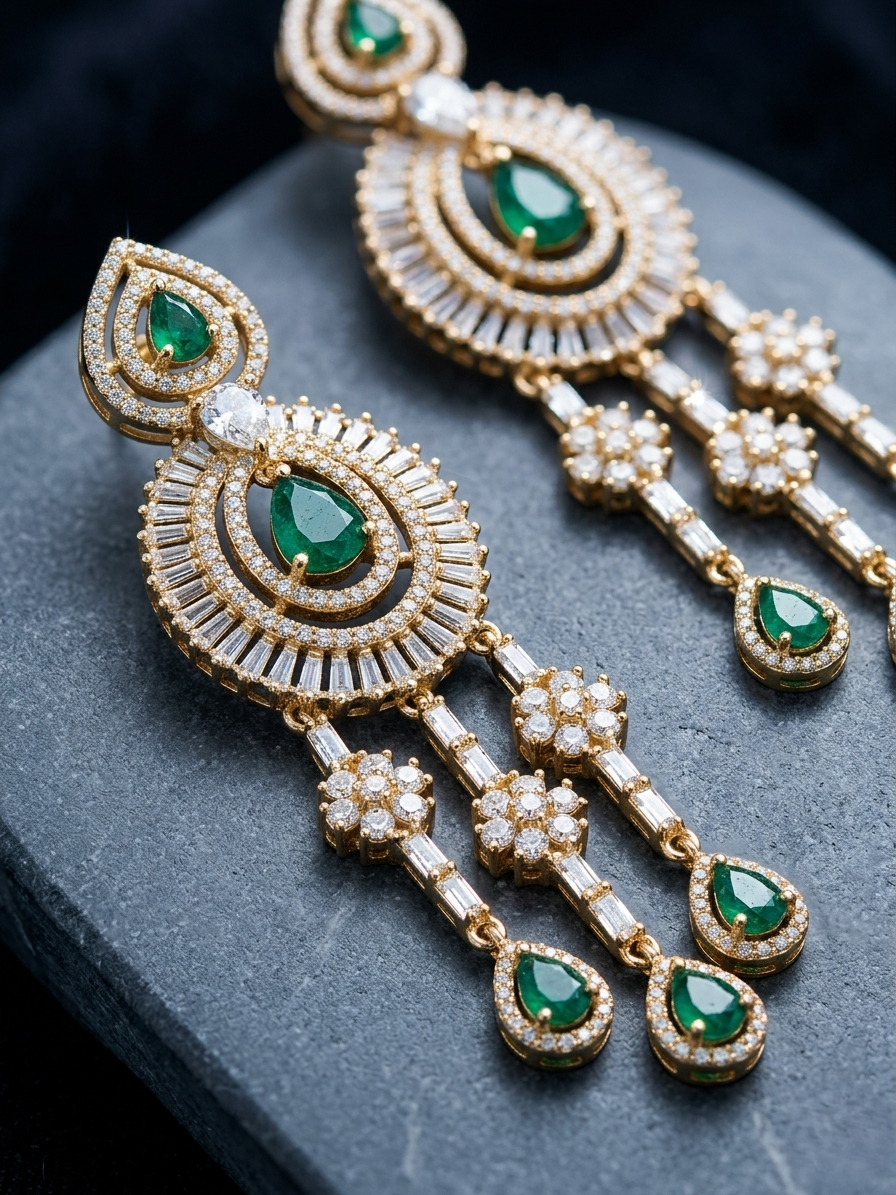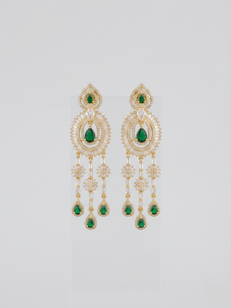 These exquisite earrings are crafted in a rich gold-tone finish, featuring a layered drop design. The top showcases a teardrop-shaped stud adorned with a vivid emerald green stone, leading into a beautifully detailed oval centerpiece encrusted with shimmering American diamonds. Delicate floral motifs connect the structure to multiple dangling strands, each accented with petite stones and finished with elegant green teardrop drops. The intricate craftsmanship and balanced composition create fluid movement and a luxurious sparkle, enhancing the overall regal appeal.