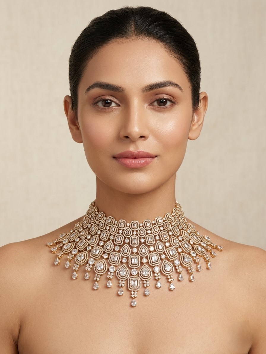 Gold Bridal Choker Necklace with American Diamonds | Luxury Statement Wedding Jewel