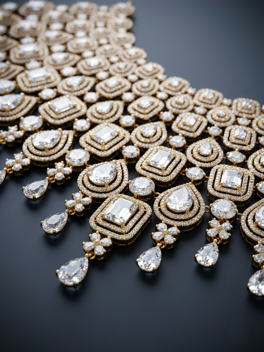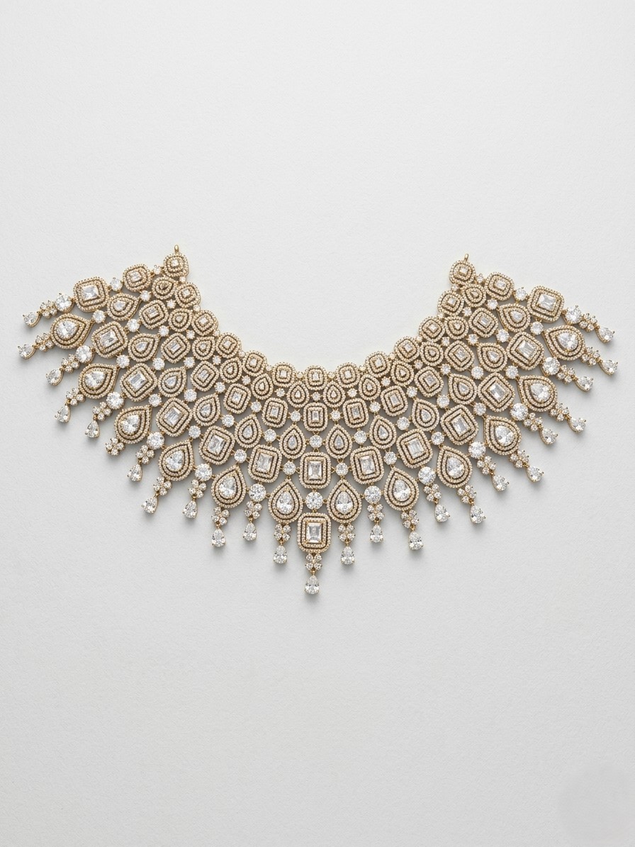 This statement choker features a gold-tone finish with an elaborate lattice of geometric and teardrop motifs, fully adorned with sparkling American diamonds. The design is enhanced with layered patterns and delicate dangling drops that add fluid movement and brilliance. The symmetrical arrangement and fine craftsmanship create a luxurious and eye-catching appeal.
