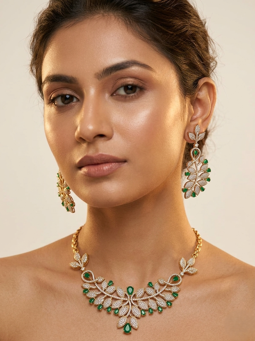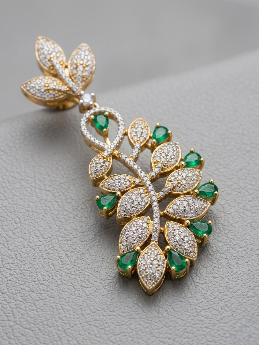 These stunning drop earrings feature a gold-tone finish with a beautifully crafted leaf motif. Adorned with shimmering American diamonds and vibrant green stones, the design flows in a natural, cascading pattern. The intricate detailing and lightweight structure give them a refined and sophisticated look, ideal for any occasion.