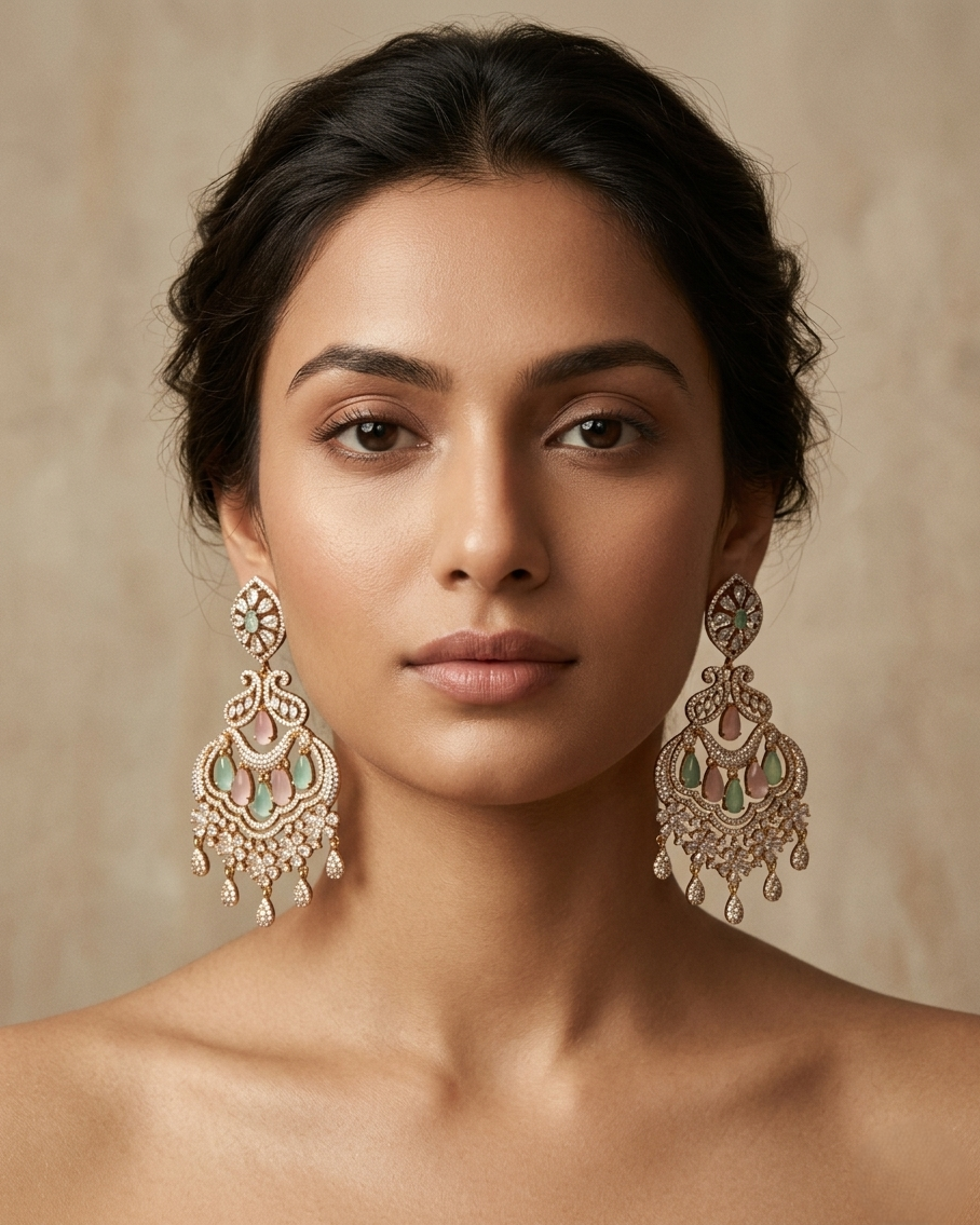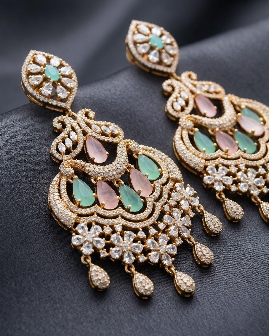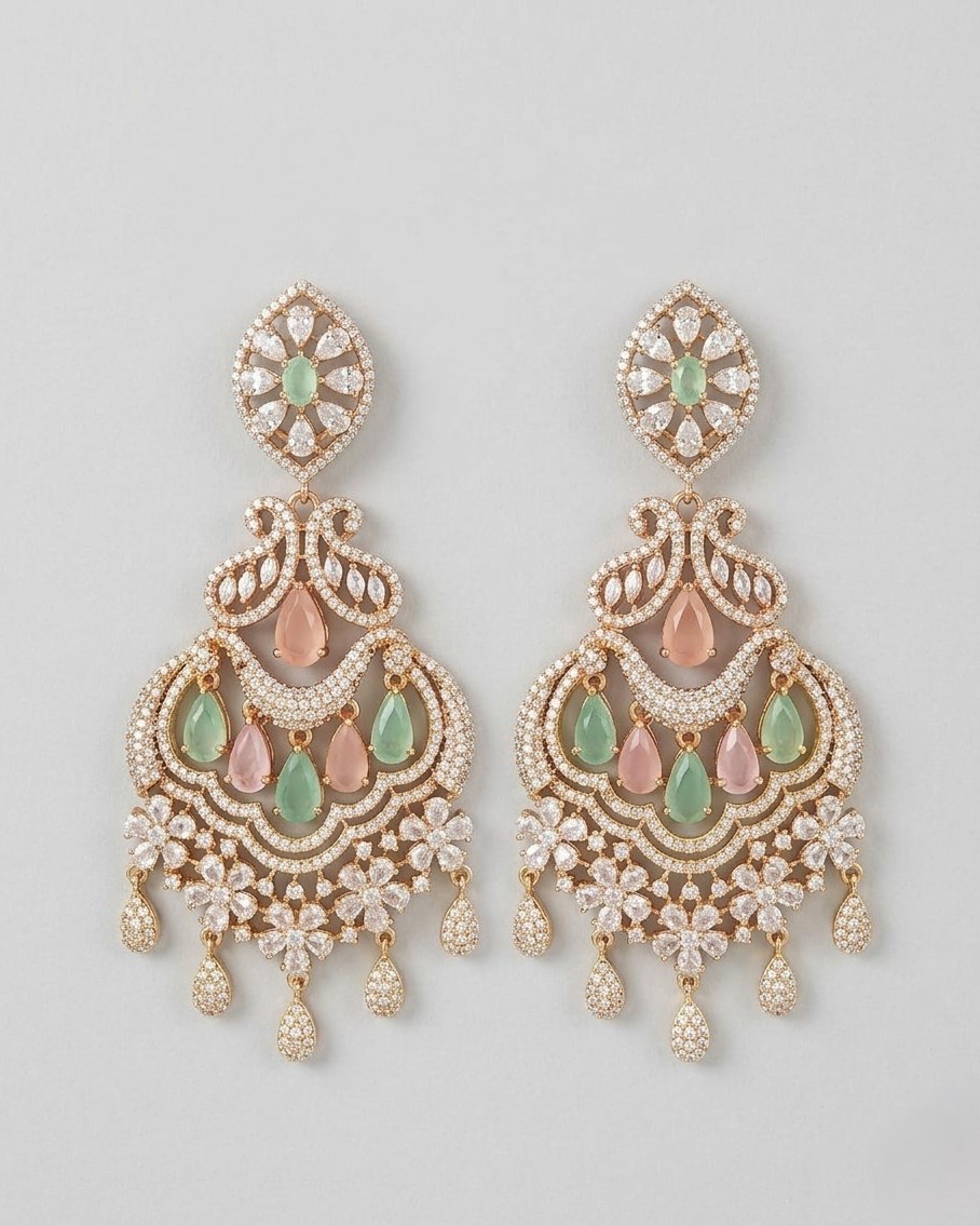 These chandelier earrings are gold-tone and have an elaborate multi-layered design with beautiful American diamonds. Also used are soft pastel hues of green (mint) and pink (blush) in teardrop gemstone shapes, which together create stunning motion and sparkly floral designs.