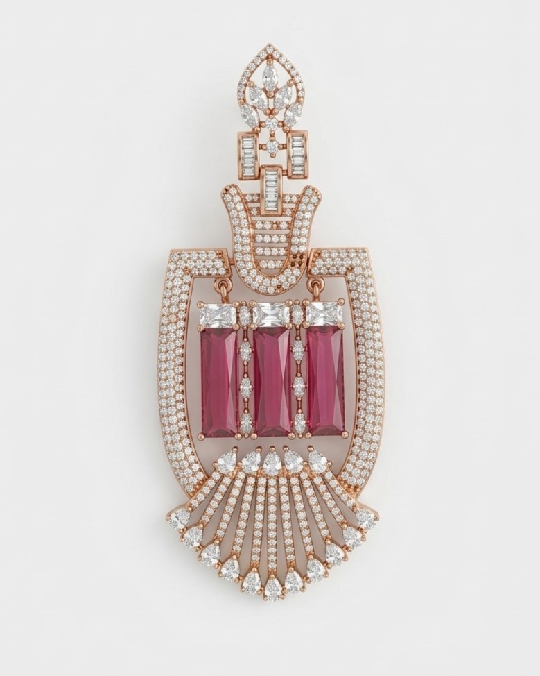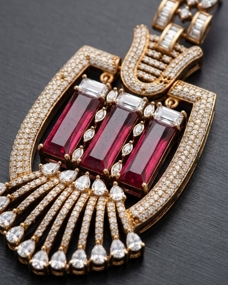 Chandeliers of these statement earrings are created utilizing a gold-tone mount and are elaborately designed with multiple tiers. The brilliant American diamonds as well as brilliant and large red rectangle rubies with delicate diamond detailing on the upper portion of the earrings and the cascading finish provide incredible motion and brilliance to the earrings. The combination of the geometric and floral design is unique and lends itself to an extremely luxurious appearance.