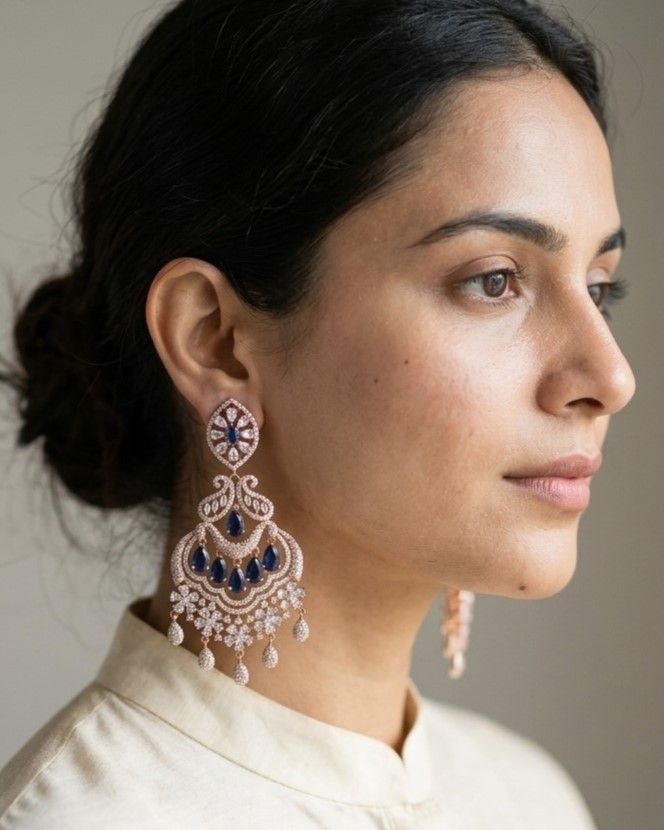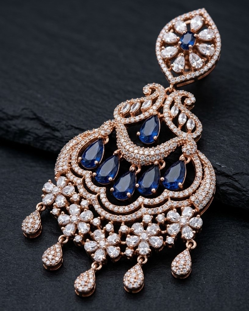 These statement earrings are exquisitely crafted in a warm rose gold-tone finish, featuring a cascading chandelier silhouette. The upper stud showcases a delicate floral pattern adorned with shimmering American diamonds, leading into an ornate arrangement of curved filigree elements. Rich sapphire blue teardrop stones are gracefully suspended throughout the design, adding depth and vibrant contrast. The lower portion is finished with intricate clusters of fine stones and delicate drops, creating fluid movement and a captivating sparkle with every turn. Lightweight yet bold, these earrings offer a perfect balance of structure and grace.
