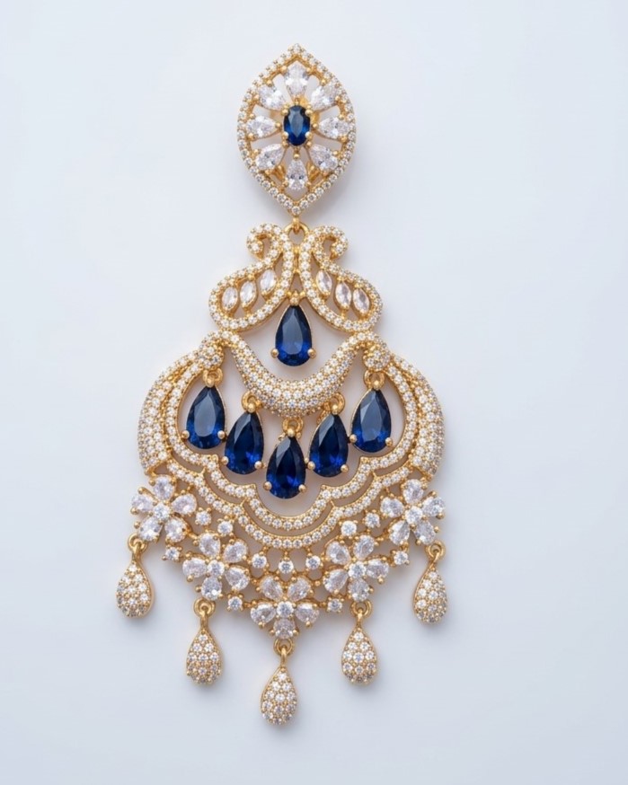 Style these earrings with evening gowns, sarees, or fusion outfits in neutral tones, navy, or metallic shades to highlight the deep blue accents. Opt for sleek buns, low chignons, or side-swept hair to showcase their full elegance. Keep other jewelry minimal to let these striking earrings stand out as the centerpiece of your look.