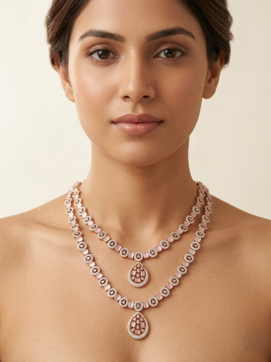 Inspired by timeless elegance and modern minimal luxury, this layered necklace set blends classic charm with contemporary sophistication. The soft rose tones add a romantic and graceful appeal, perfect for refined styling.