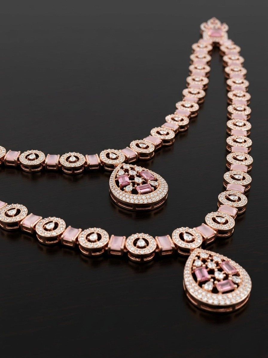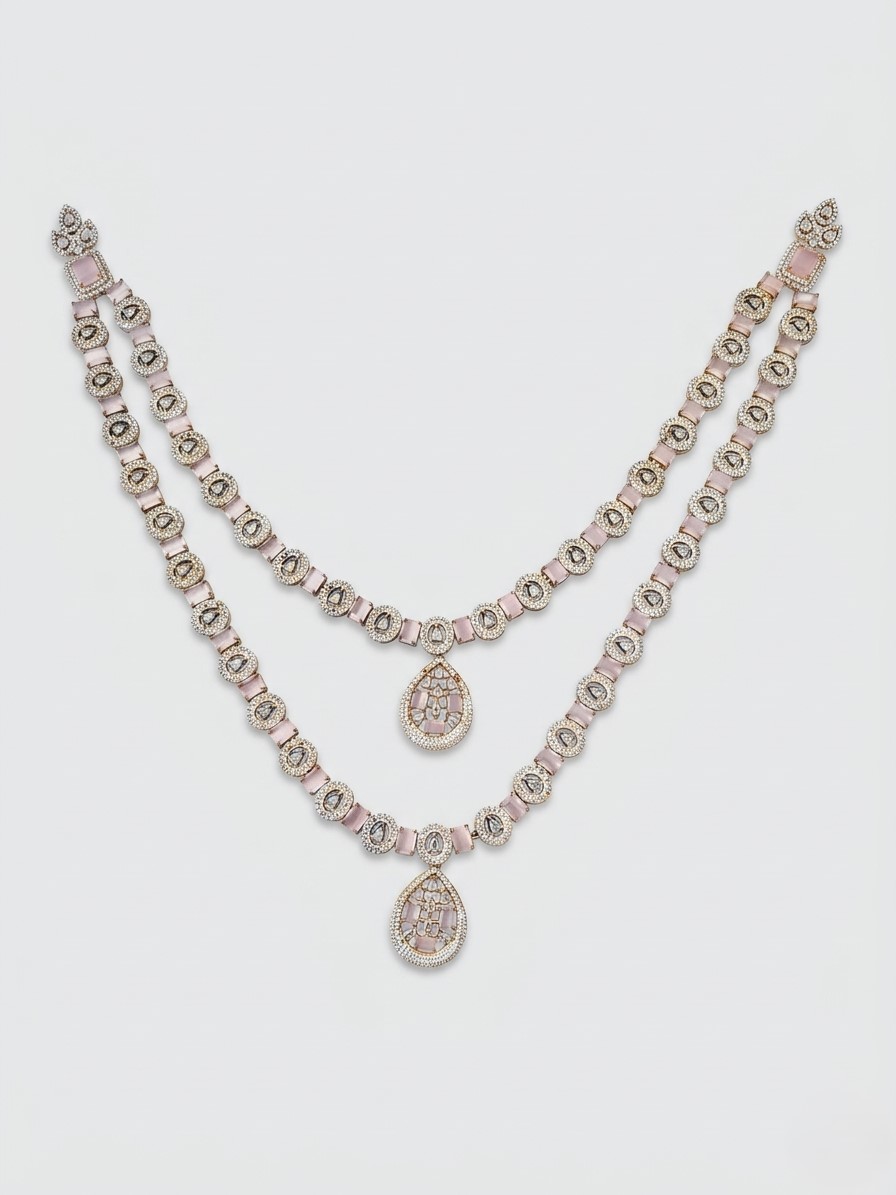 This necklace set features a rose gold-tone finish with a beautiful double-layered design. Each layer is adorned with finely set American diamonds in delicate circular motifs, creating a consistent and elegant pattern. The highlight is the teardrop-shaped pendants on both layers, featuring intricate detailing and sparkling stones that add depth and charm. The balanced layering offers a stylish yet graceful look.