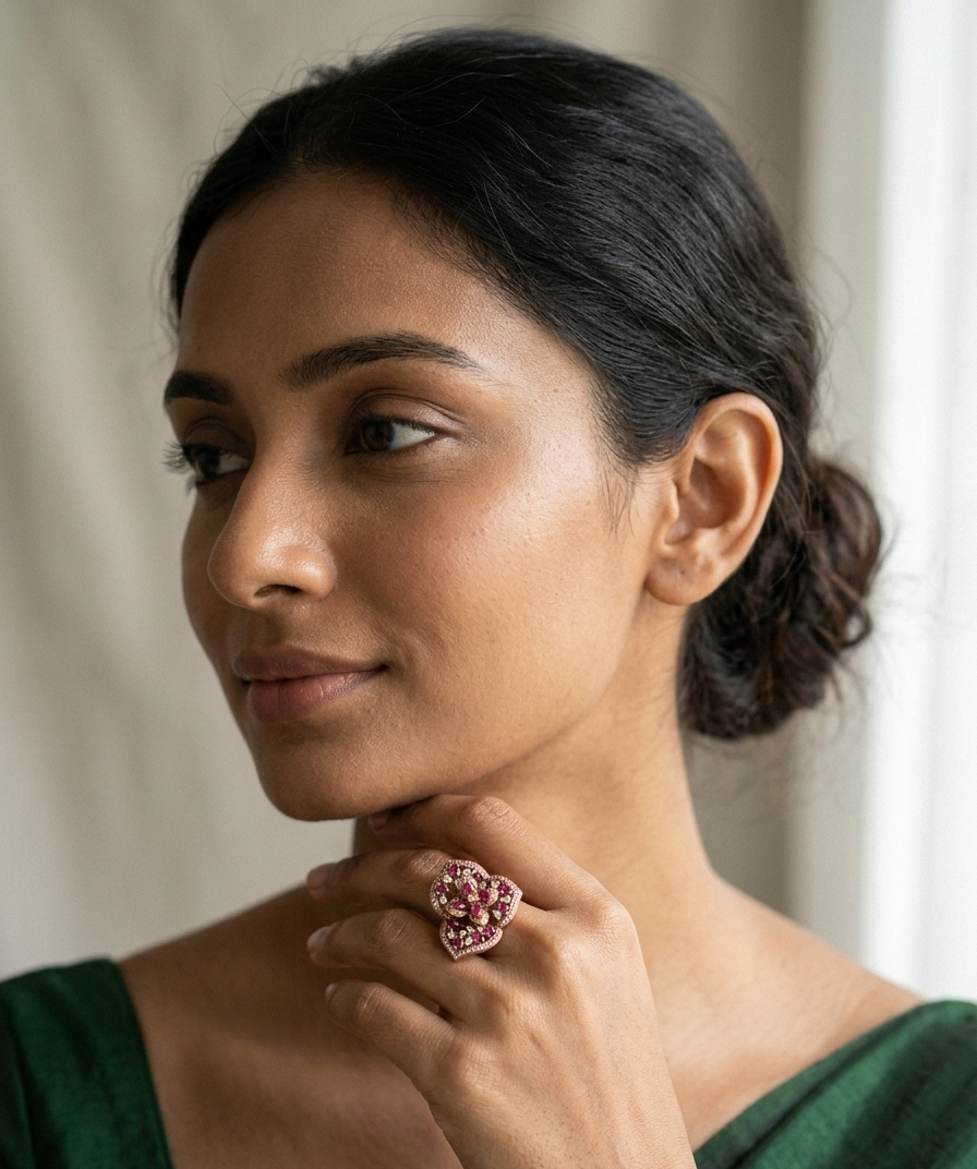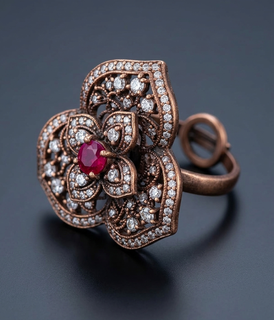 Pair this ring with traditional or evening outfits in shades like beige, gold, wine, or black for a striking look. Keep your other accessories minimal to let this elegant floral piece stand out effortlessly.