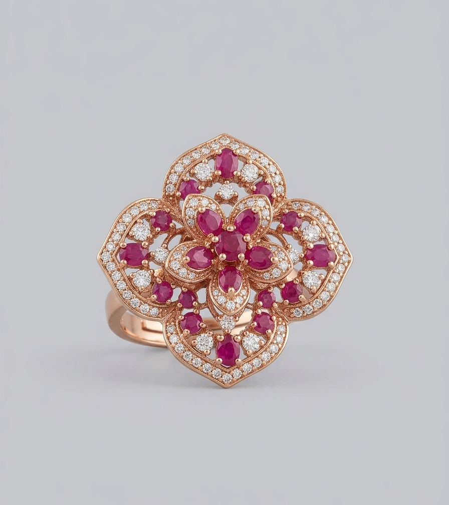 This bold cocktail ring features a gold-tone finish with a beautifully crafted floral cluster design. Adorned with sparkling American diamonds and vibrant ruby red stones, the petals form a layered bloom that creates depth and brilliance. The intricate detailing and soft curves give the ring a luxurious and feminine appeal.