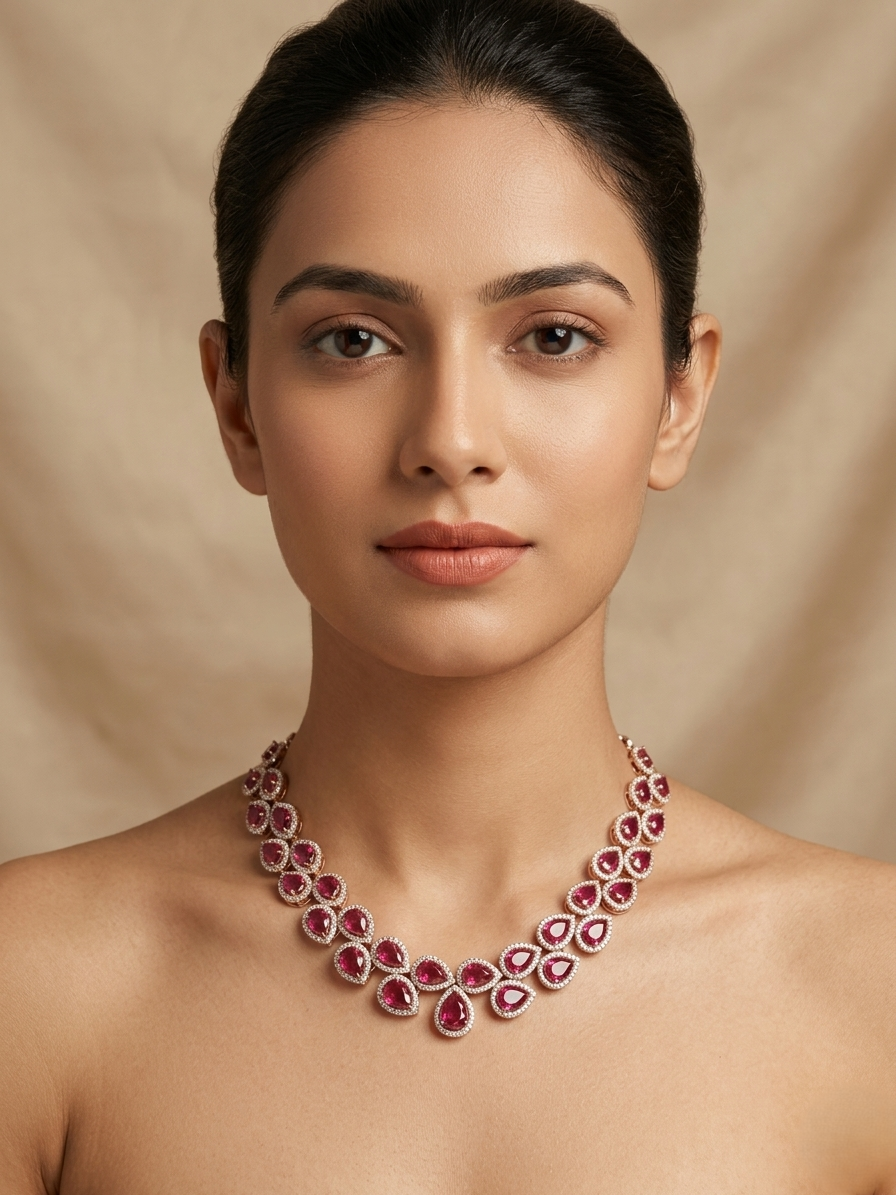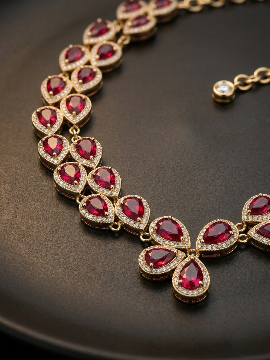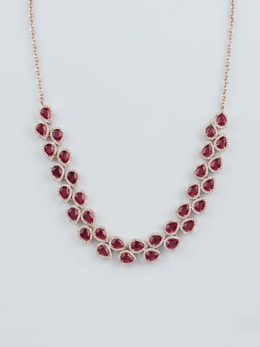 This exquisite necklace features a graceful arrangement of teardrop-shaped ruby red stones, each encircled by shimmering American diamonds for a radiant finish. Set in a refined silver-tone base, the design forms a delicate yet striking pattern that sits beautifully along the neckline. The symmetrical placement of stones creates a fluid, cascading effect, enhancing its luxurious appeal. Lightweight yet impactful, this piece is crafted to deliver both comfort and brilliance.